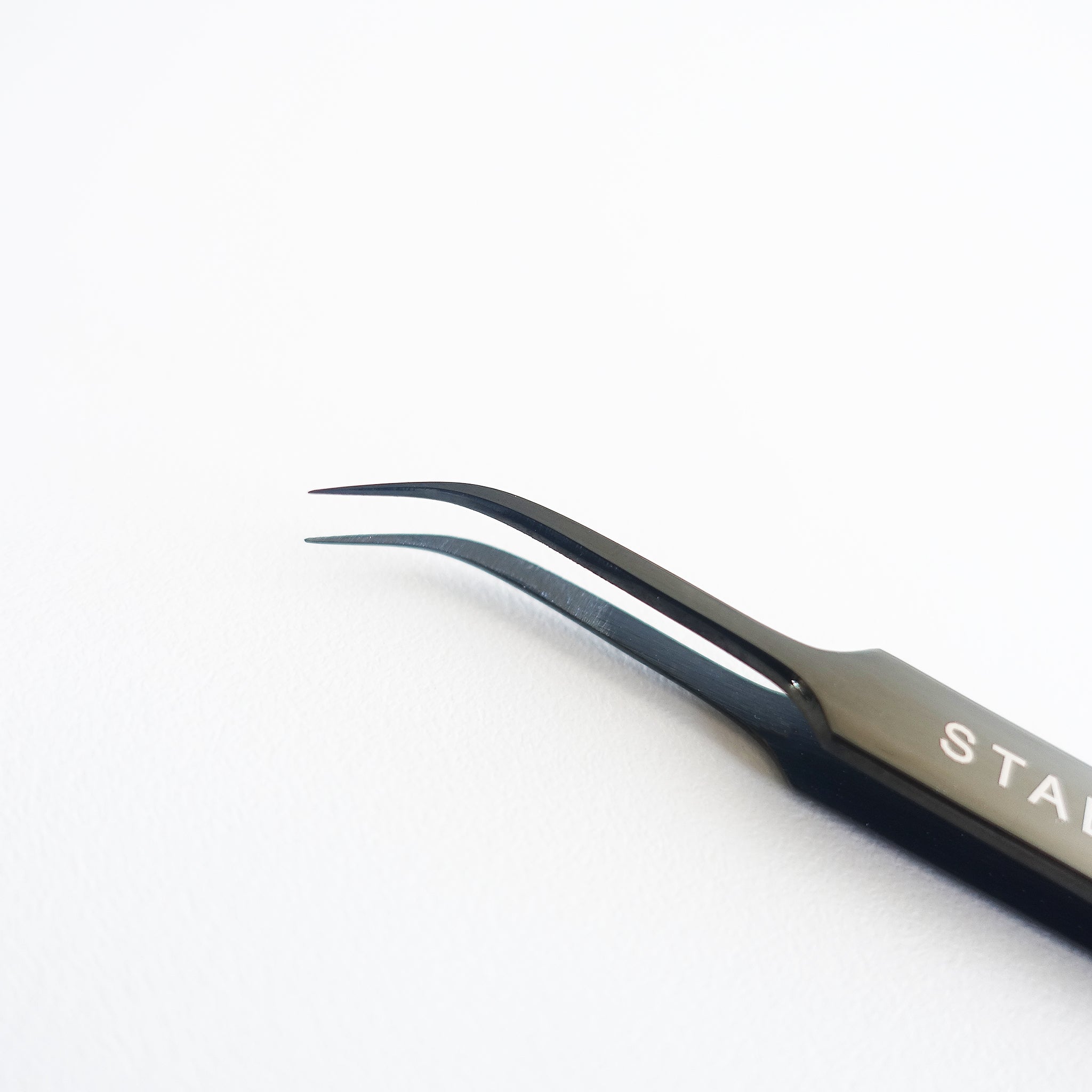 Featuring an ultra sharp tip allowing for perfect lash isolation. An incredible tool to banana peel during an infill process. Angled at 45° and enriched in a shiny chrome black finish.